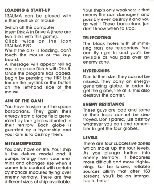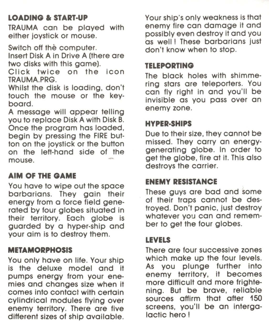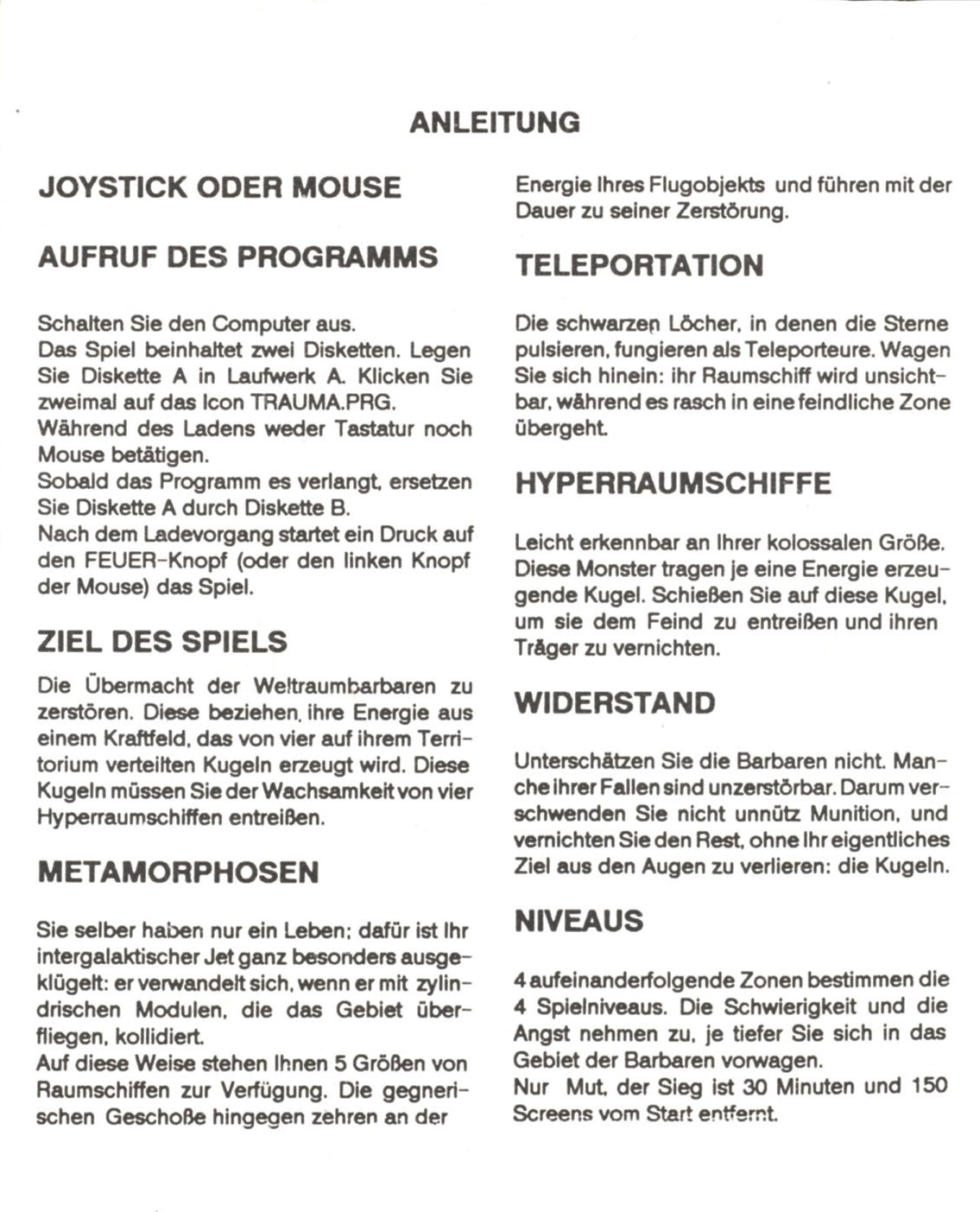 This is a 1987 release of Trauma. It was released in Germany, United Kingdom, published by Ere Informatique, distributed by Infogrames. Its license is commercial.