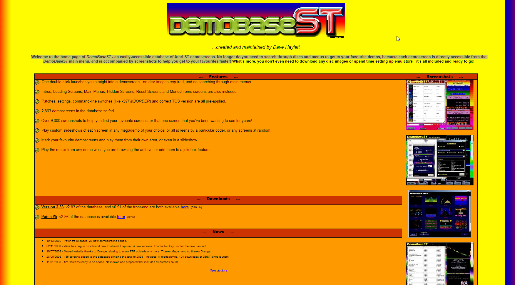 Welcome to the home page of DemoBaseST - an easily-accessible database of Atari ST demoscreens. No longer do you need to search through discs and menus to get to your favourite demos, because each demoscreen is directly accessible from the DemoBaseST main menu, and is accompanied by screenshots to help you get to your favourites faster!